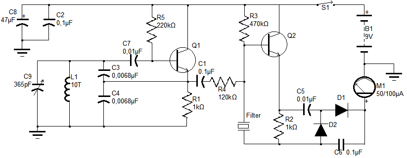Με τη χρήση ενός ταλαντωτή, το κύκλωμα λειτουργεί σε συχνότητα 455kHz. Ανάλογα τη θέση του ανιχνευτή και την απόσταση από το μέταλλο, η συχνότητα αυτή αυξομειώνεται και υπάρχει μια ανάλογη ένδειξη στο μετρητή Μ1. Το κεραμικό φίλτρο Filter έχει μια επιλεκτική ζώνη διέλευσης που οδηγεί στο αντίστοιχο αποτέλεσμα. Το πηνίο L1 μπορεί να είναι 4'' διάμετρος στις σπείρες με πλαστική θωράκιση. Γι' αυτό χρειάζονται 10 τυλίγματα. Επίσης χρειάζεται ένας μετρητής συχνοτήτων για παρατηρούμε την αυξομείωση της συχνότητας μέσω του μετάλλου L. Τέλος πρέπει να εξακριβώσουμε τη λειτουργία των τρανζίστορ σε 455kHz.